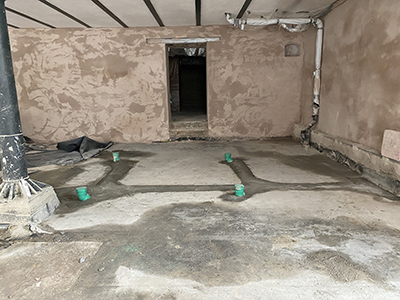 Einbetonierte Abwasseranschlüsse im Untergeschoss des Getreidelagers und Estricharbeiten im kleinen Lagerraum des Sudhauses. |