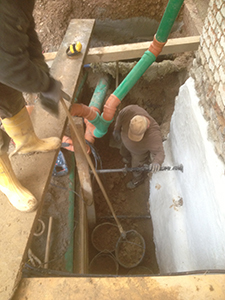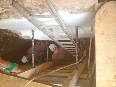 13.03.2018 Im Grabenschacht an den hangseits gelegenen Grundmauern des Malzhauses wird Isolierputz gegen eindringende Feuchtigkeit aufgebracht. |