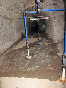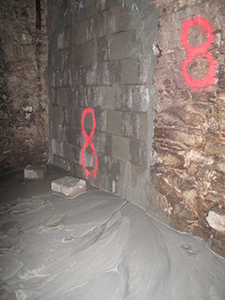 17.02.2018 Die hinteren, parallel laufenden Gewölbesegmente im Eiskeller wurden zugemauert, da die Bereiche jenseits davon mit einem Betongemisch verfüllt werden. Diese Verfüllung ist aus statischen Gründen notwendig, da über diesen Eiskellerteilen, die weit in den Hang der Liegenschaft Walkmühle hineinreichen, in Kürze mit dem Bau eines Mehrfamilienhauses begonnen werden soll. Das Datum auf der Vermauerung zeigt den aktuellen Füllstand des Betongemisches jenseits der Mauer an. Durch Fugen und Ritzen sickert ein Wenig des Gemisches hindurch. Die Vorstellung, dass jenseits der Mauer ein Teil historischer Baugeschichte für immer in Hunderten von Kubikmetern Beton versinkt, ist beklemmend. Aber angeblich unerlässlich denn die Neubebauung mit Wohnhäusern ist für eine Finanzierung des Gesamtsanierungsvorhabens der Walkmühle notwendig. |