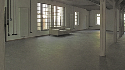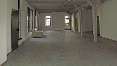 01.10.2019 Rostschutzanstrich auf der zentralen Säule und den Deckenträgern des großen Saals. In der Raumecke lässt sich deckenseits der für die Treppe zum Dachgeschoss erforderliche Durchbruch erkennen. |