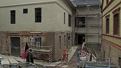 Rechts: Blick vom Dachgeschoss Brauhaus auf die Fassadenrestaurateure am Sudhaus. |