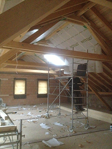 Die Innenflächen des Daches im Malzhaus werden für die Befüllung mit Dämmmaterial vorbereitet.