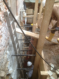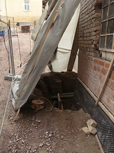 Arbeiten an der Nordseite des Malzhauses. Hier wurden die im Erdreich liegenden Außenmauern freigelegt, um sie gegen eindringende Feuchtigkeit abzudichten.