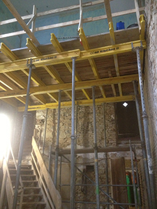 Schalungsarbeiten und Vorbereitungen für eine neue Geschossdecke im Turm – dem ehemaligen Atelier von Bernhard Schmerl und zukünftigen Treppenhaus.
