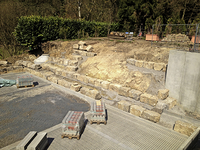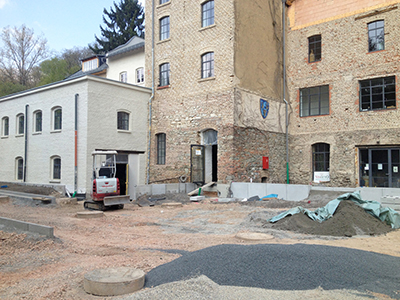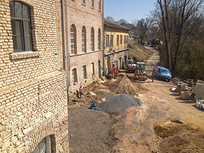 09.04.2020 Arbeiten an den Außenanlagen auf der Südseite vor dem Getreidelager und dem Brauhaus. |