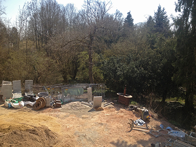 02.04.2020 Die Südseite als Materiallager für die Arbeiten an den Außenanlagen. |