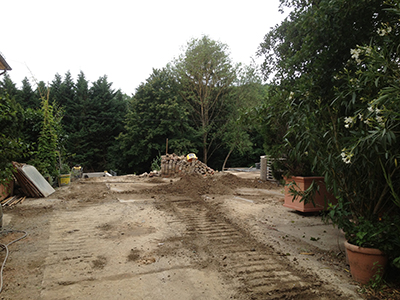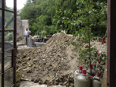 "Schlachtfeld" mit Aushub im Garten des Pferdestalls nach dem erneuten Ausgraben der bereits gesetzten aber abgesackten Betonstützmauerelemente. | |