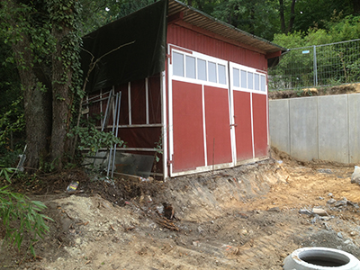 Das rote Garagenhäuschen temporär auf einem unfreiwilligen Erdsockel ... |