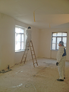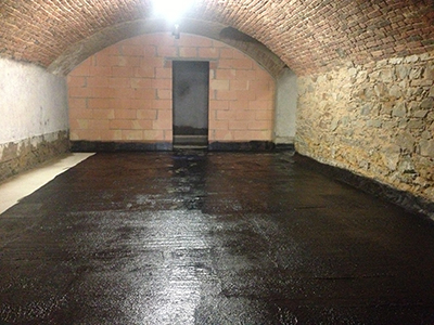 18.10.2017 Links: Im Erdgeschoss des Mühlenhauses wird der Wandputz geschliffen. Rechts: Bodenabdichtung auf dem neuen Estrich im "Vinotto"-Gewölbe. |