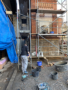 Der alte Putz an der Nordfassade des Turms wird entfernt. |