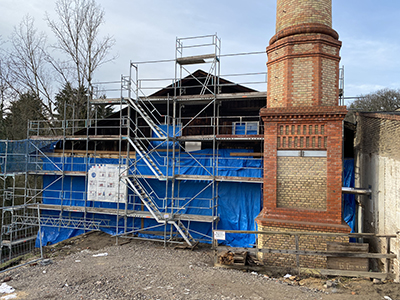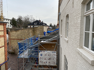 Eingerüstete Ostfassade des Kühlschiffs. Rechts: Im Hintergrund der voranschreitende Neubau. |