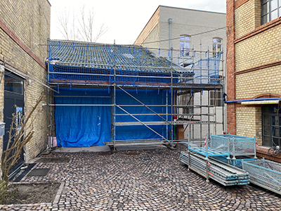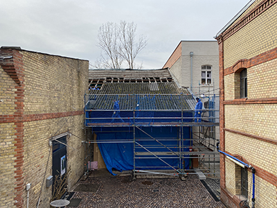 18.02.2021 Das mit Schadstoffen belastete Dach des Kühlschiffs wird abgedeckt. |