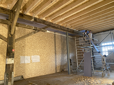 Beginn der Beplankung an der Holzbalkendecke des Kühlschiffs. |