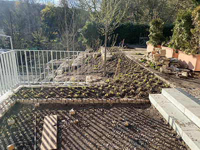 Neupflanzung mit "Bodendeckern" an der kleinen Terrasse des Pferdestalls und Neuanlage des Hangs seitlich der ehemaligen roten Garage. |