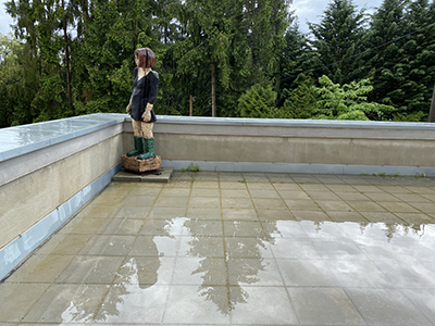 26.05.2021 Verstopfte Fugen verhindern nach einem starken Regen das Abfließen des Wassers von der Terrasse über dem Getreidelager ... |