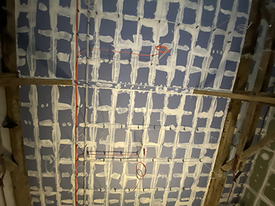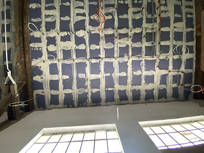 15.06.2021 Gespachtelte Rigipsplatten im Kühlschiff an den Wänden und an der Brandschutzdecke. Dort befinden sich bereits die ersten Kabelzüge für die Ausstellungsbeleuchtung, die Deckenleinwand und für die Projektorauslässe. |