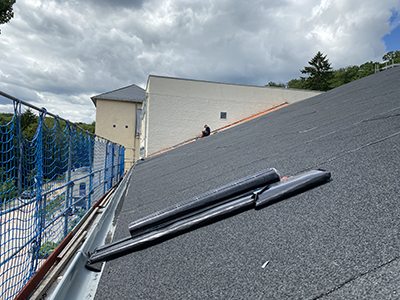 15.07.2021 Mit Dachpappebahnen neu gedecktes Dach des Kühlschiffs. |