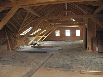 Das Dach des Malzhauses von innen und außen betrachtet. Wie man sehen kann, ist die Dachdeckung mit Schiefer bereits fast abgeschlossen.