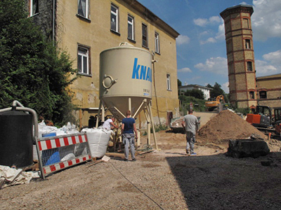 Silo für die Bereitung des Wandputzes im Mühlengebäude.