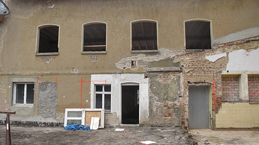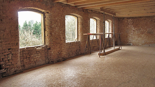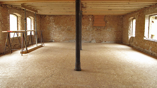 | Obergeschoss des Getreidelagers. Hier werden Vorbereitungen zur kompletten Erneuerung der darüberliegenden Terrassendecke getroffen. | ||||||||
