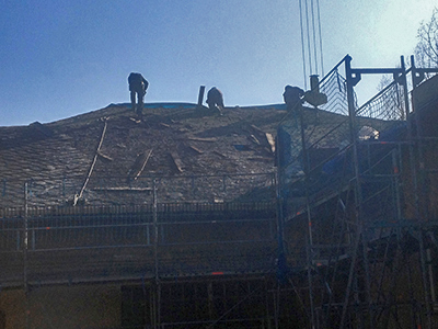 | Das durch Planen geschützte, bereits partiell abgedeckte Dach des Malzhauses. |