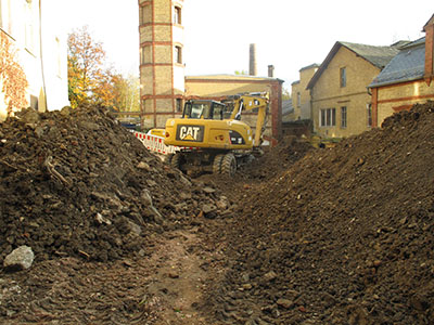 Arbeiten an der Kanalisation im Mühlenhof. Gut zu erkennen: Der neu entdeckte historische Brunnenschacht. | |||