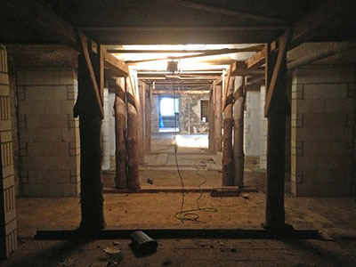 Statische Ertüchtigung durch Untermauern der Träger im Keller des Pferdestalles. |