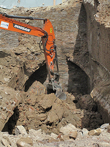02.05.2018 Abbrucharbeiten an den ehemaligen Eiskellern. Mit dem Blick von oben erschließen sich die Dimensionen des Mehrfamilienhauses, das hier entstehen wird. |