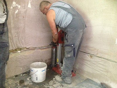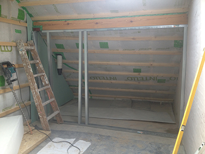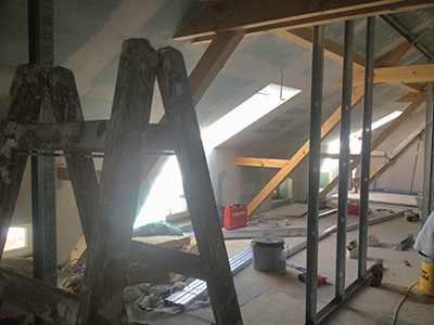 09.08.2018 Südflügel Dachgeschoss: Verlegung von Elektrik, Wasser- und Heizungsleitungen. Hier entsteht ein Gemeinschaftsatelier mit zugehöriger Bad- und Teekücheneinheit. |