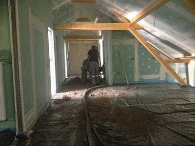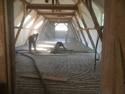 04.09.2018 Der Estrich im künftigen Gemeinschaftsatelier im Dachgeschoss des Pferdestalles wird gegossen und bedeckt die Heizschleifen der Fußbodenheizung. |