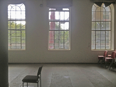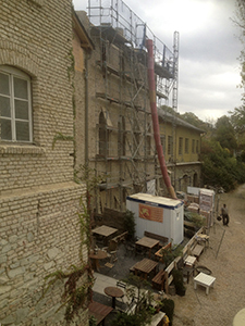 Entsorgung des Bauschutts vom Dach des Brauhauses. Von außen und vom großen Veranstaltungssaal aus gesehen. | ||