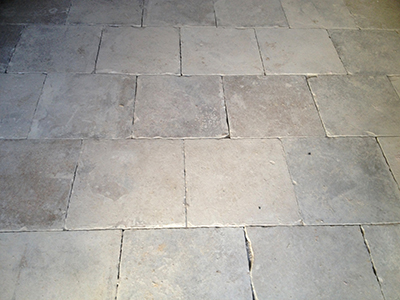 10.02.2019 Im Obergeschoss des Getreidelagers werden die "rückgewonnenen" Solnhofener Kalksteinplatten zur Restaurierung des Fußbodens eingesetzt. |