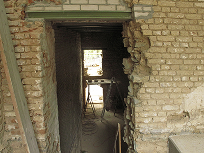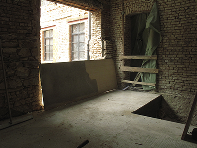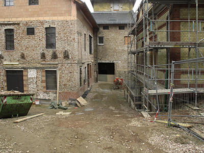 04. + 06.03.2019 Erdgeschoss Malzhaus: Der Durchgang zwischen späterem Atelier und großem Veranstaltungssaal wird zugemauert (links). Rechts: Blick in den Veranstaltungsraum. |