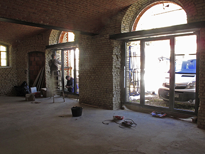 Einbau der neuen Türen und Bogenfenster an der ebenerdigen Nordseite des Sudhauses.