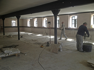 Links: Fußbodenarbeiten im Obergeschoss des Getreidelagers.