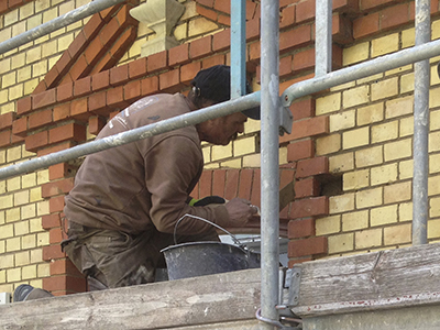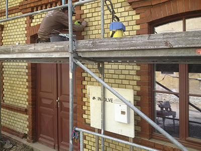 Echtes Kunsthandwerk am Mühlenhaus: Einzelne Klinker werden ersetzt und mit schmalsten Spachteln neu verfugt.