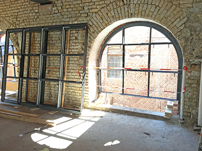 Einsetzen der großen Bogenfenster im Sudhaus.