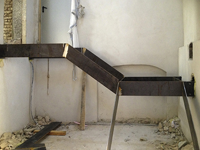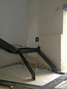 Die ersten Stahlwangen der komplexen, alle Stockwerke erschließenden Treppe im Turm bzw. Südflügel wurden montiert.