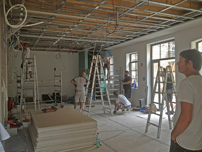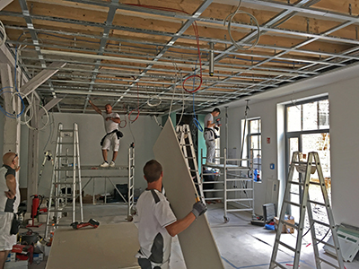 Montage der abgehängten Decke im Veranstaltungsraum des Malzhaus EGs. |